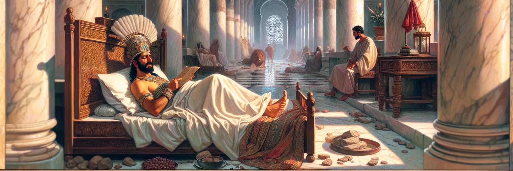 Aquella noche, en las estancias altas del palacio de Susa, el sueño se le había vuelto esquivo al rey Asuero. No era el vino, ni el peso de la corona. Era una inquietud sorda, un malestar sin nombre que le hacía dar vueltas en el lecho de marfil. El aire, pesado y cálido, olía a jazmín y a polvo de mármol. Finalmente, con un gruñido de fastidio, se levantó. Las baldosas del suelo estaban frías bajo sus pies descalzos. Llamó a un sirviente con un gesto seco.