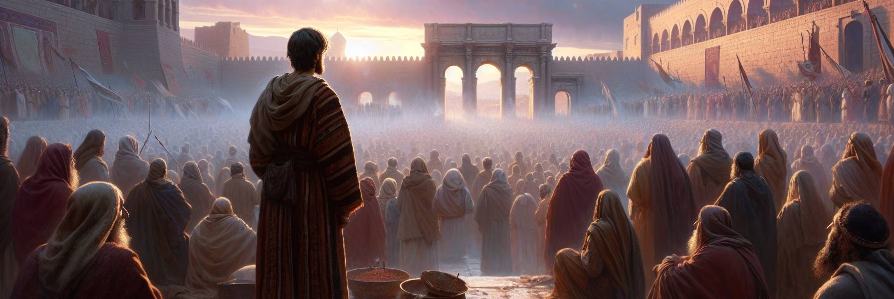 Cuando el Príncipe salió, lo hizo por el camino por el que había entrado. La puerta no se cerraba tras él de inmediato. Quedaba abierta hasta el atardecer, un portal de luz y gracia accesible. El pueblo común podía acercarse entonces al umbral de esa misma puerta, a adorar mirando hacia el interior, hacia el lugar donde el humo aún ascendía. Eliab vio a familias enteras, a ancianos con las manos temblorosas alzadas, a un niño que se dormía en los brazos de su madre, agotado por la larga espera. No era el caos bullicioso de las antiguas fiestas, sino una quietud expectante. La ley era clara: el pueblo adoraba desde el exterior, en orden, sin invadir los espacios reservados. Y así debía ser.