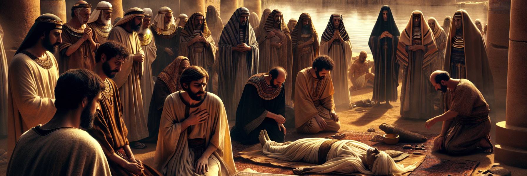 Allí, en esa tierra de nadie entre Egipto y la promesa, guardaron siete días de duelo. Los lamentos no eran ceremoniales; eran desgarradores, ásperos. Los hermanos gritaban su dolor, un dolor que era por Jacob, sí, pero también por los años perdidos, por la culpa que yacía como una losa sobre sus pechos. José, en silencio, lloraba con una quietud que asustaba. Las lágrimas le surcaban el rostro sin emitir sonido.