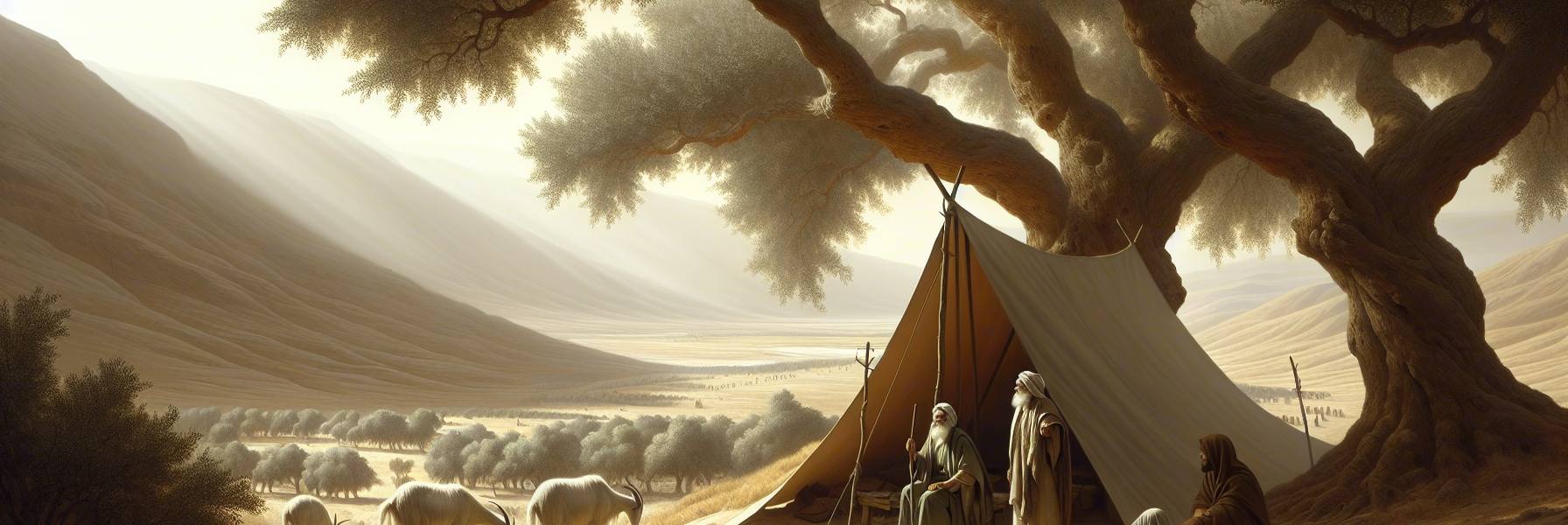 El calor del mediodía pesaba sobre la llanura, un manto silencioso y dorado que hacía brillar el polvo del camino. A la sombra de las encinas de Mamre, Abraham permanecía sentado a la entrada de su tienda. Los años, muchos ya, se notaban en el peso con que se apoyaba en el bastón, pero no en la mirada, atenta aún al horizonte.