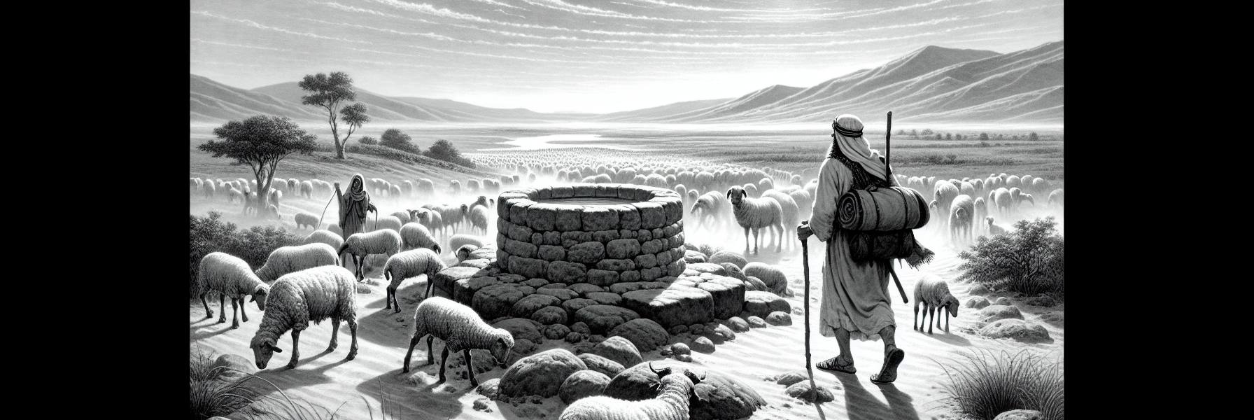 El sol de Harán era un manto pesado y polvoriento sobre los hombros de Jacob. Había caminado semanas, guiado por la promesa de su madre y el eco de la bendición robada. La tierra de sus antepasados le recibió con una sequedad que le recordaba a su propia sed: no solo de agua, sino de un nuevo comienzo. El olor a tierra agrietada y a hierbas aromáticas quemadas por el calor llenaba el aire. A lo lejos, divisó un pozo, una boca de piedra rodeada por el desgaste de generaciones, y tres rebaños de ovejas agrupados en la sombra escasa de unas rocas. Los pastores, con sus rostros curtidos y sus voces ásperas, observaban con indolencia el paso del tiempo.