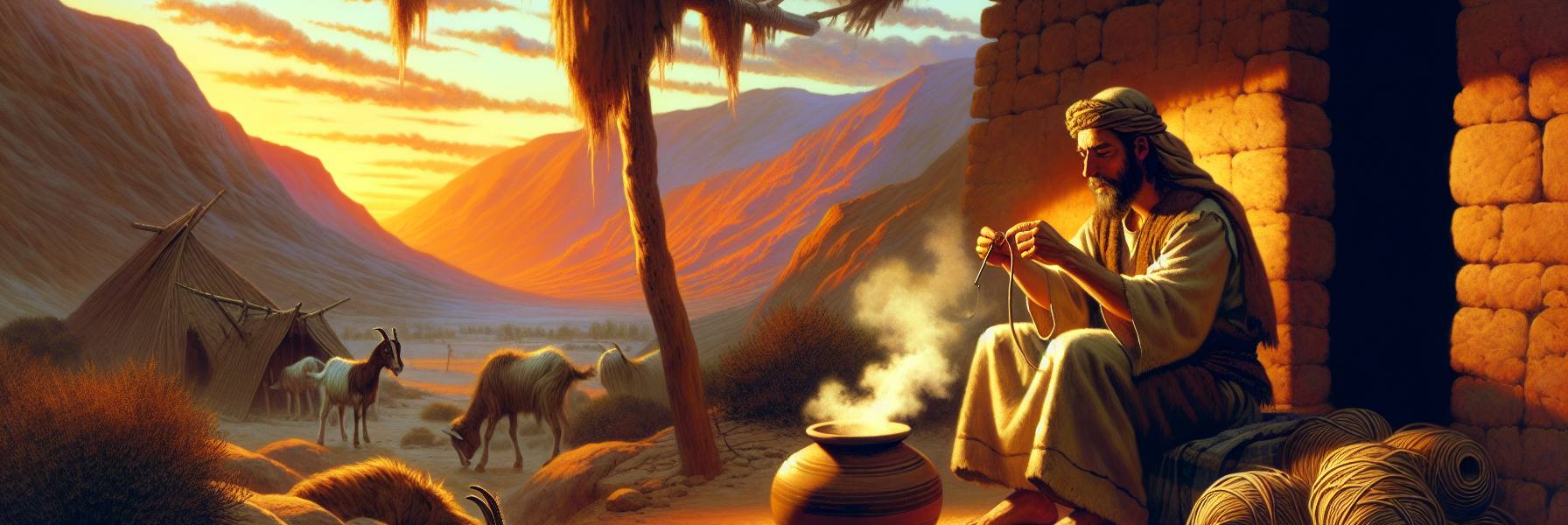 Al atardecer, cuando el sol comenzaba a teñir de púrpra y naranja las colinas, llegó el último caso. Un hombre extranjero, un madianita que viajaba con una pequeña caravana, se quejó de que unos jóvenes del campamento habían arrojado piedras a sus camellos, hiriendo a uno. Los muchachos, traídos por sus padres, negaban haberlo hecho a propósito. Era una travesura, decían.