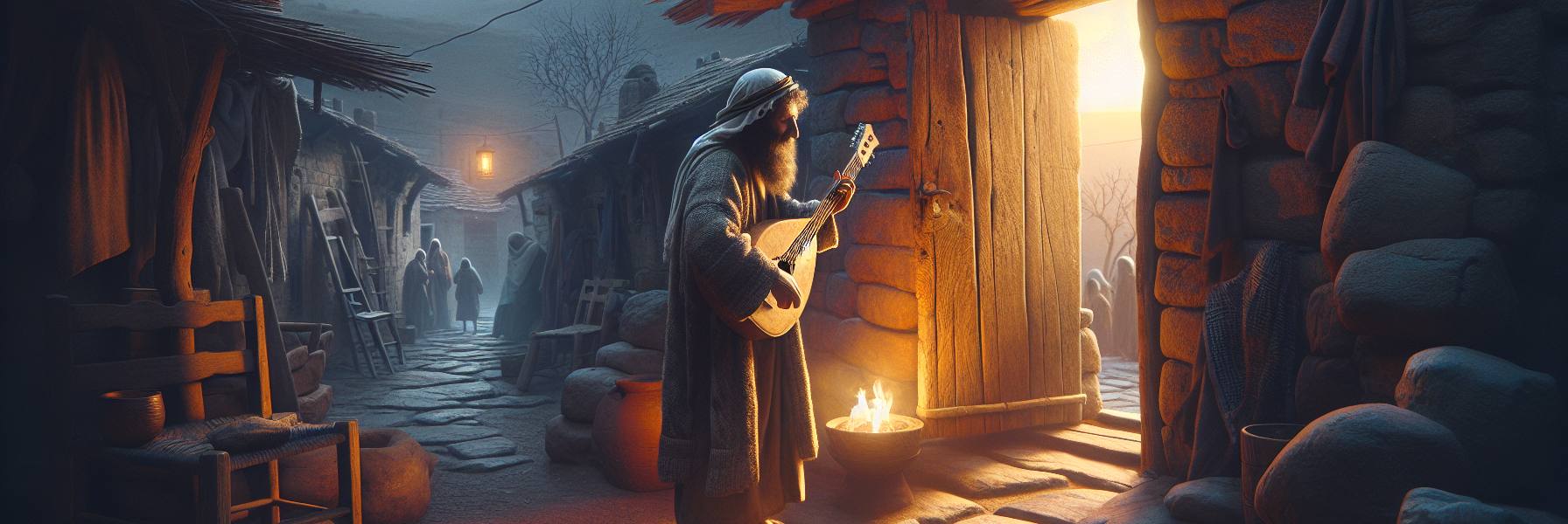 Al día siguiente, en lugar de ir directamente al taller, fue a la casa de Abigail, la viuda cuyo hijo había sido golpeado por los salteadores. No llevó una espada. Llevó un cesto con pan de Shoshana y su presencia. Se sentó con ella en el suelo y no dijo palabras huecas. Cantó. Cantó en voz baja el salmo de la alegría, el de la danza en Sion. Al principio, ella lo miró con incredulidad, con ojos enrojecidos por el llanto. Pero la música, tosca y persistente, hizo su trabajo. No alejó el dolor, pero lo rodeó. Lo puso ante el trono de un Rey que escuchaba. Era un acto de guerra distinto. Una afirmación de que el gozo de Dios era más fuerte que la crueldad de los hombres.