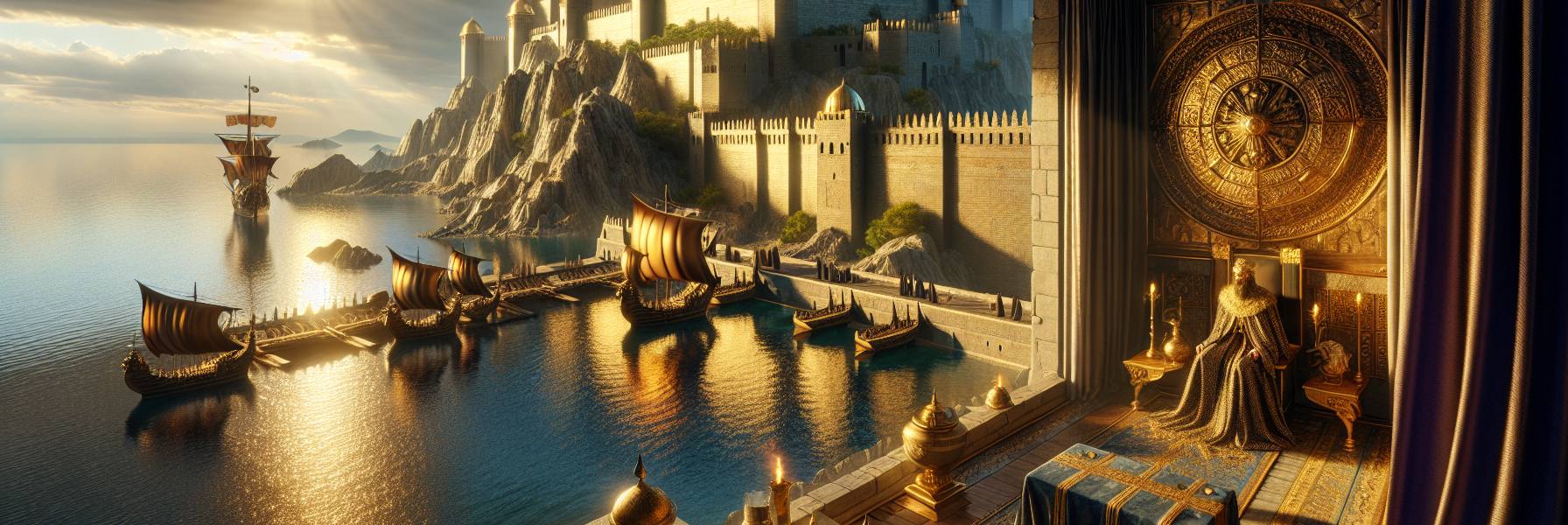 El rey se paseaba junto a la balaustrada de mármol, sus ojos, de un azul frío como el vidrio de Sidón, recorriendo sin ver la bahía donde sus galeras descansaban como aves de metal. Llevaba el manto de púrpura doble, el tejido tan fino que fluía como agua teñida de sangre vieja. En sus dedos, el oro no era adorno, sino una afirmación. Cada anillo, cada sello, era la prueba tangible de un acuerdo, de un tributo, de una sumisión. La corona, una diadema de esmeraldas engastadas en oro rojo, pesaba poco en su cabeza, pero el peso de lo que representaba llenaba cada rincón de su ser.